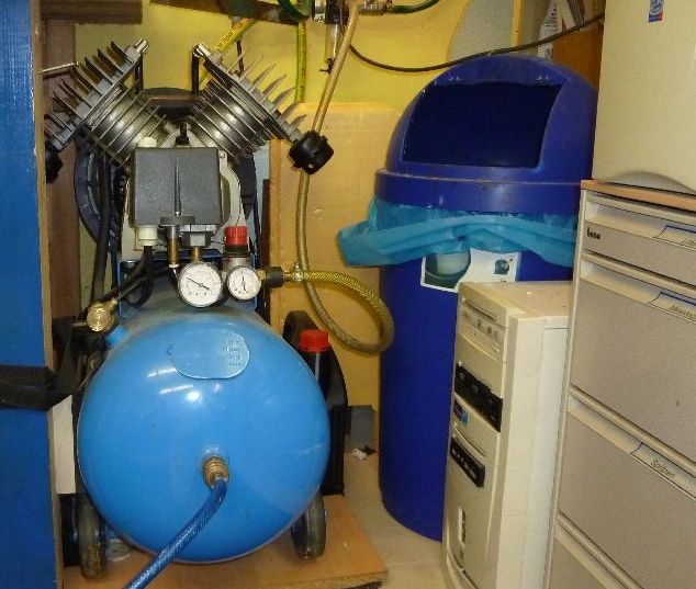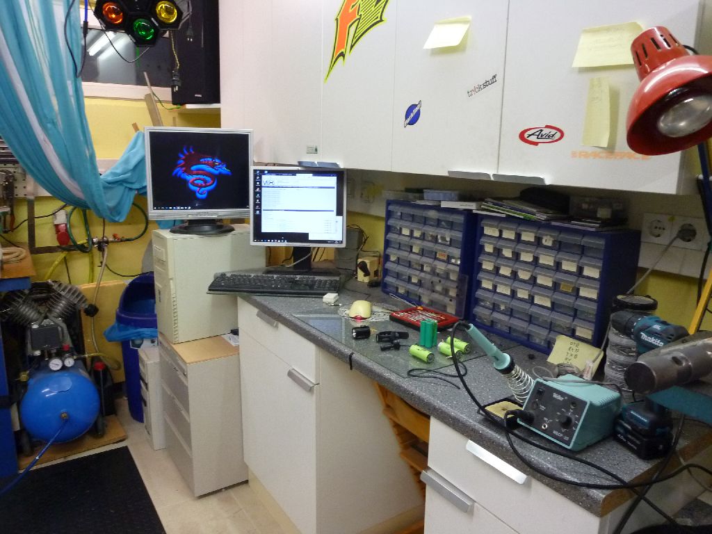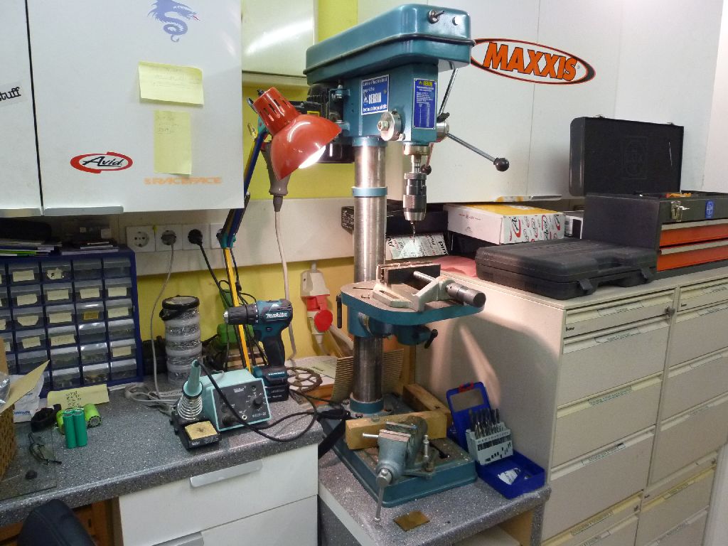 Das „Büro“ mit PC und Schreibfläche daneben, gleich mein Elektronikarbeitsplatz mit Lötstation. Eine Ständerbohrmaschine darf natürlich auch nicht fehlen.
